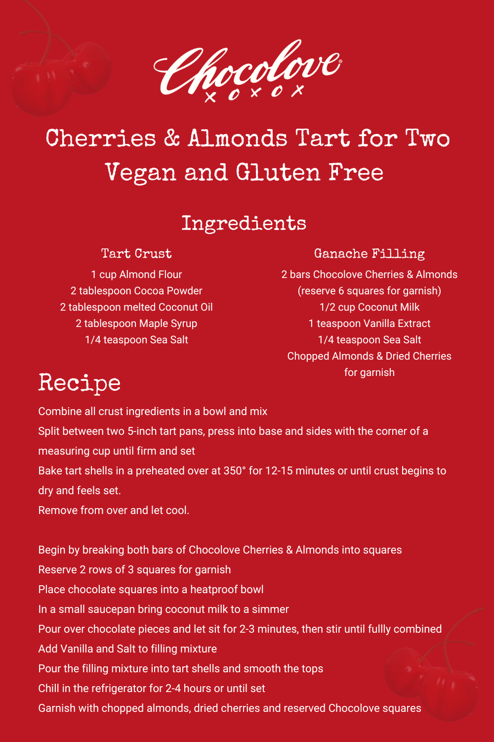 Satisfy your sweet cravings guilt-free with our Cherry Almond Tart for Two, a delectable gluten-free and vegan treat. This decadent dessert features an egg-free chocolate almond tart shell sweetened with the natural richness of maple syrup. Luxuriously filled with a velvety coconut milk-based ganache made with Chocolove Cherries and Almonds in 55% dark Belgian chocolate.