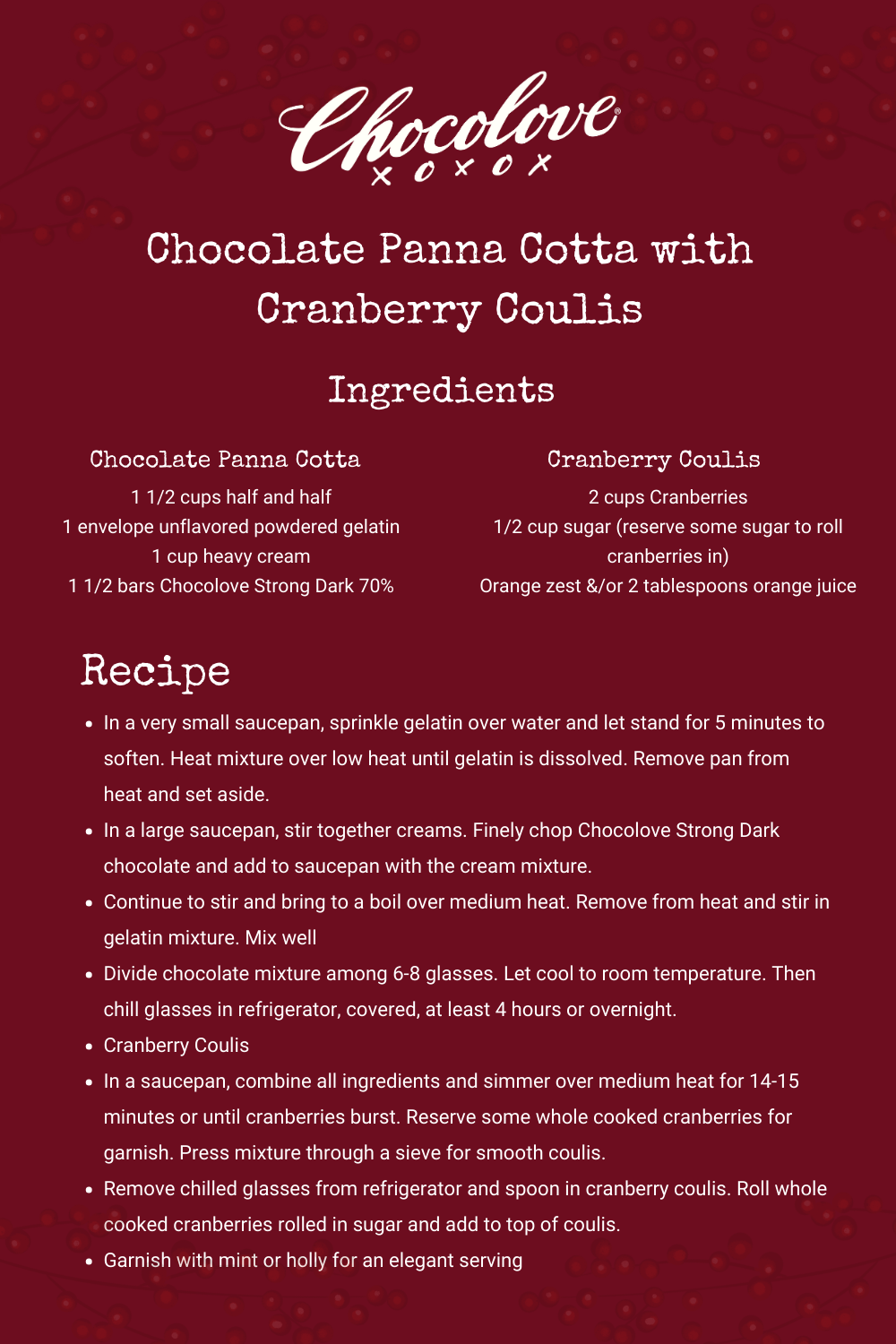 Treat yourself to the delightful simplicity of Chocolate Panna Cotta, a luscious twist on the classic Italian dessert. Crafted with Chocolove Strong Dark Chocolate 70% premium Belgian cocoa, this variation brings a rich and velvety dark chocolate dimension to the traditional creamy vanilla delight.