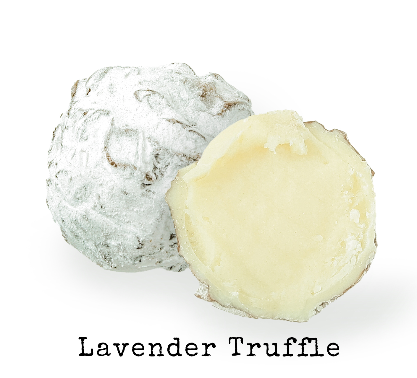 - Lavender Truffle: White chocolate lavender ganache in white chocolate, dusted with cocoa powder & powdered sugar