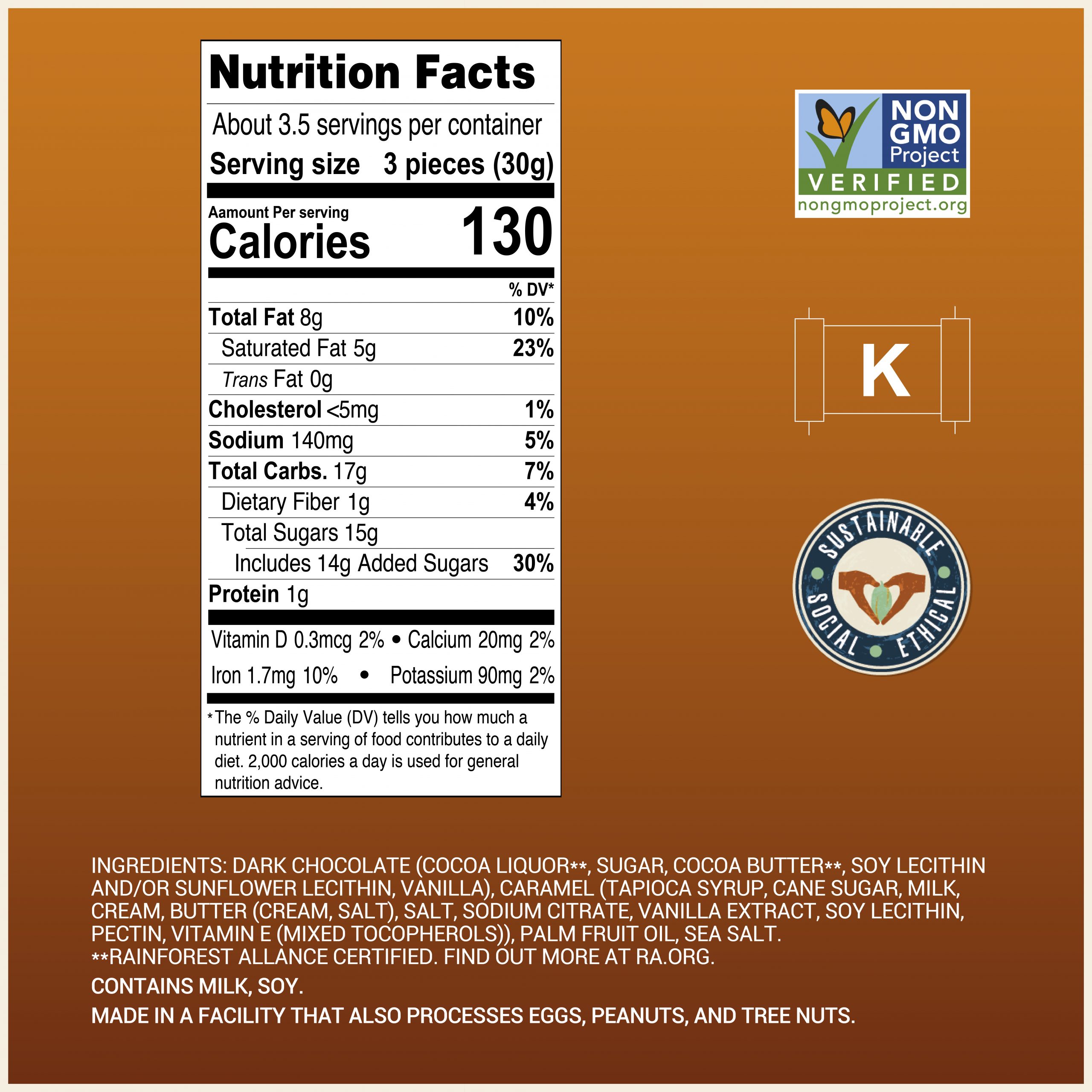 Dark Chocolate (Cocoa Liquor**, Sugar, Cocoa Butter**, Soy Lecithin and/or Sunflower Lecithin, Vanilla), Organic Caramel (Organic Tapioca Syrup, Organic Cane Sugar, Organic Milk, Organic Cream, Organic Butter (Cream, Salt), Salt, Sodium Citrate, Organic Vanilla Extract, Organic Soy Lecithin, Pectin, and Vitamin E (mixed tocopherols)), Organic Palm Fruit Oil, Sea Salt.