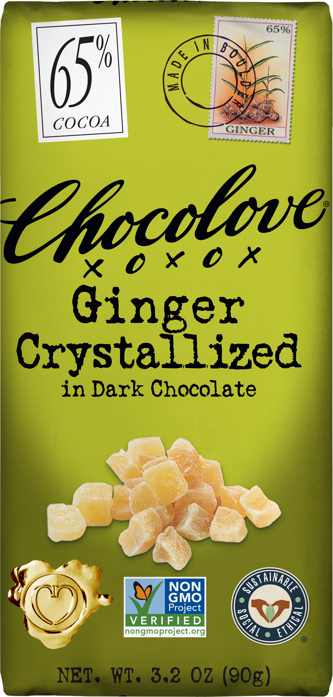 Dark Chocolate (Cocoa Liquor, Sugar, Cocoa Butter, Soy Lecithin, Vanilla), Crystallized Ginger (Ginger, Sugar).