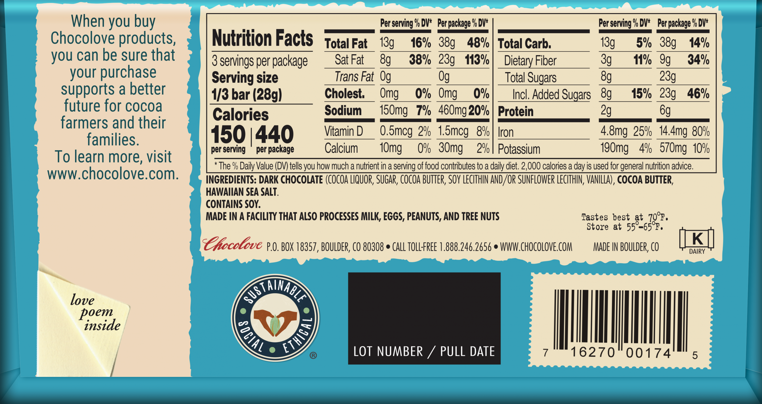 Dark Chocolate (Cocoa Liquor, Sugar, Cocoa Butter, Soy Lecithin and/or Sunflower Lecithin, Vanilla), Cocoa Butter, Hawaiian Sea Salt.