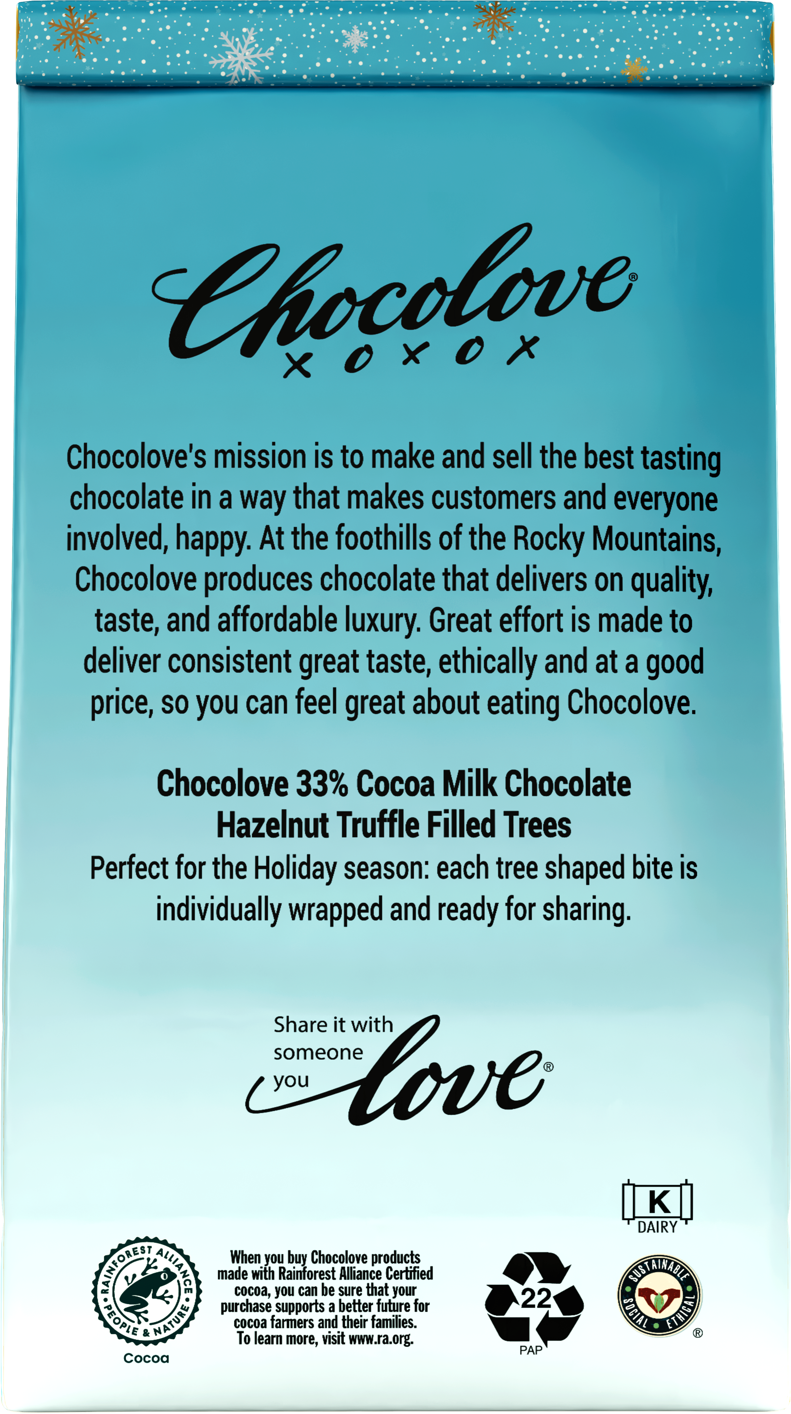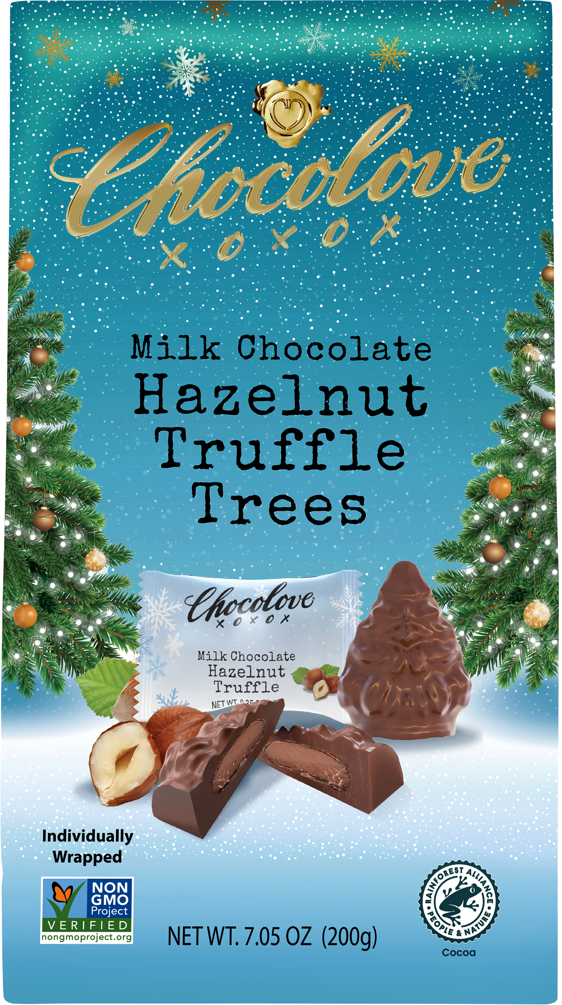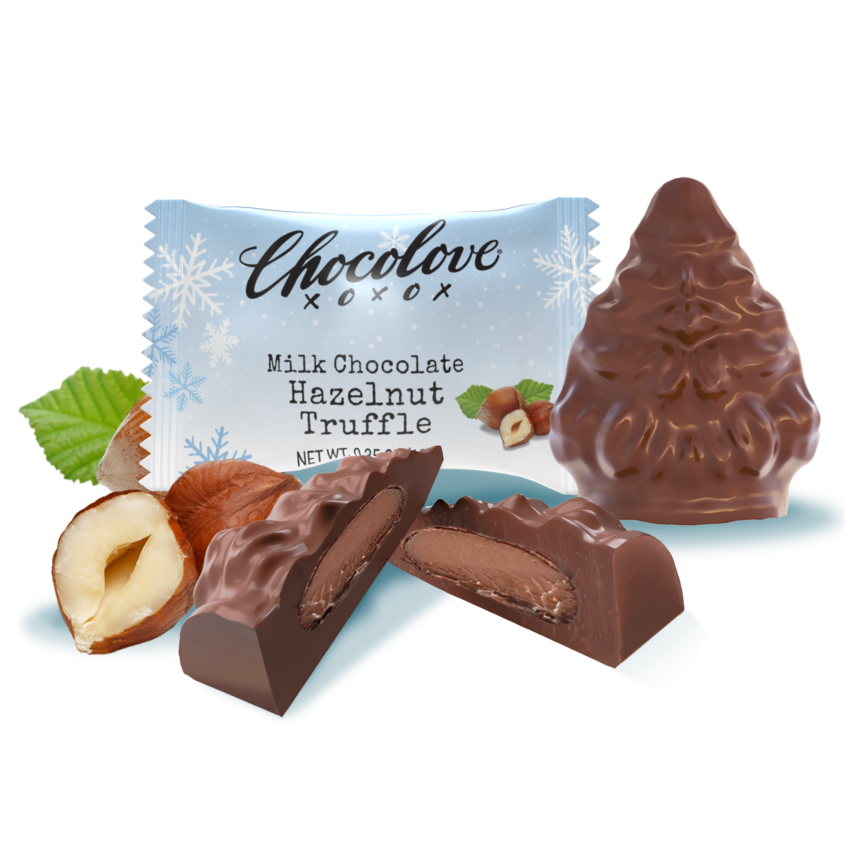 Bring a touch of seasonal warmth to your festivities with our Hazelnut Truffle in Milk Chocolate Holiday Bites. Shaped like Christmas trees, these treats combine creamy milk chocolate with the buttery flavors of roasted hazelnuts in a smooth truffle filling.