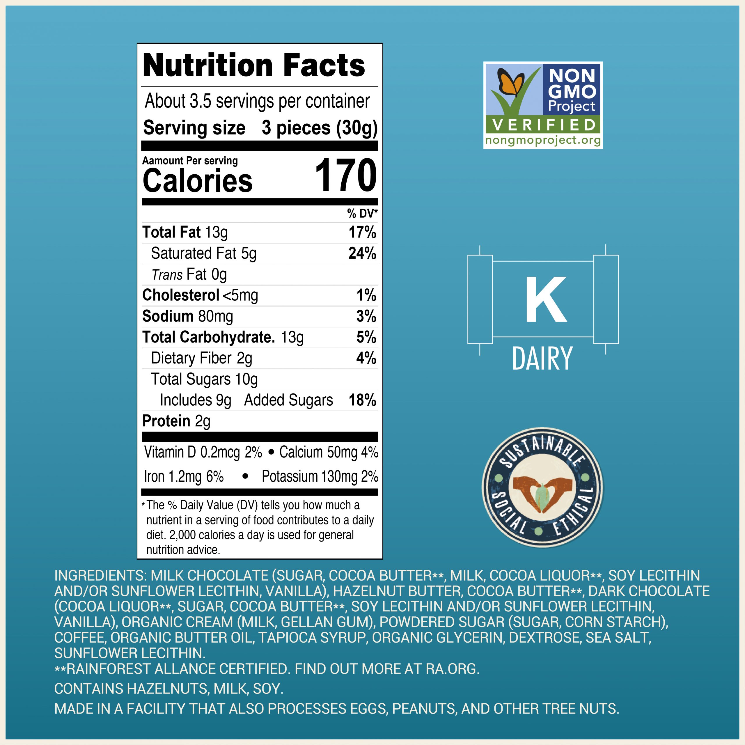 Allergens: Contains hazelnuts, milk, soy. Made in a facility that also processes eggs, peanuts, and other tree nuts.