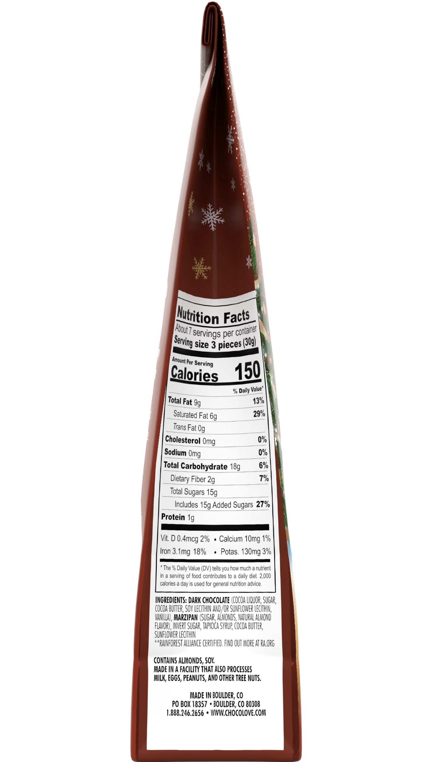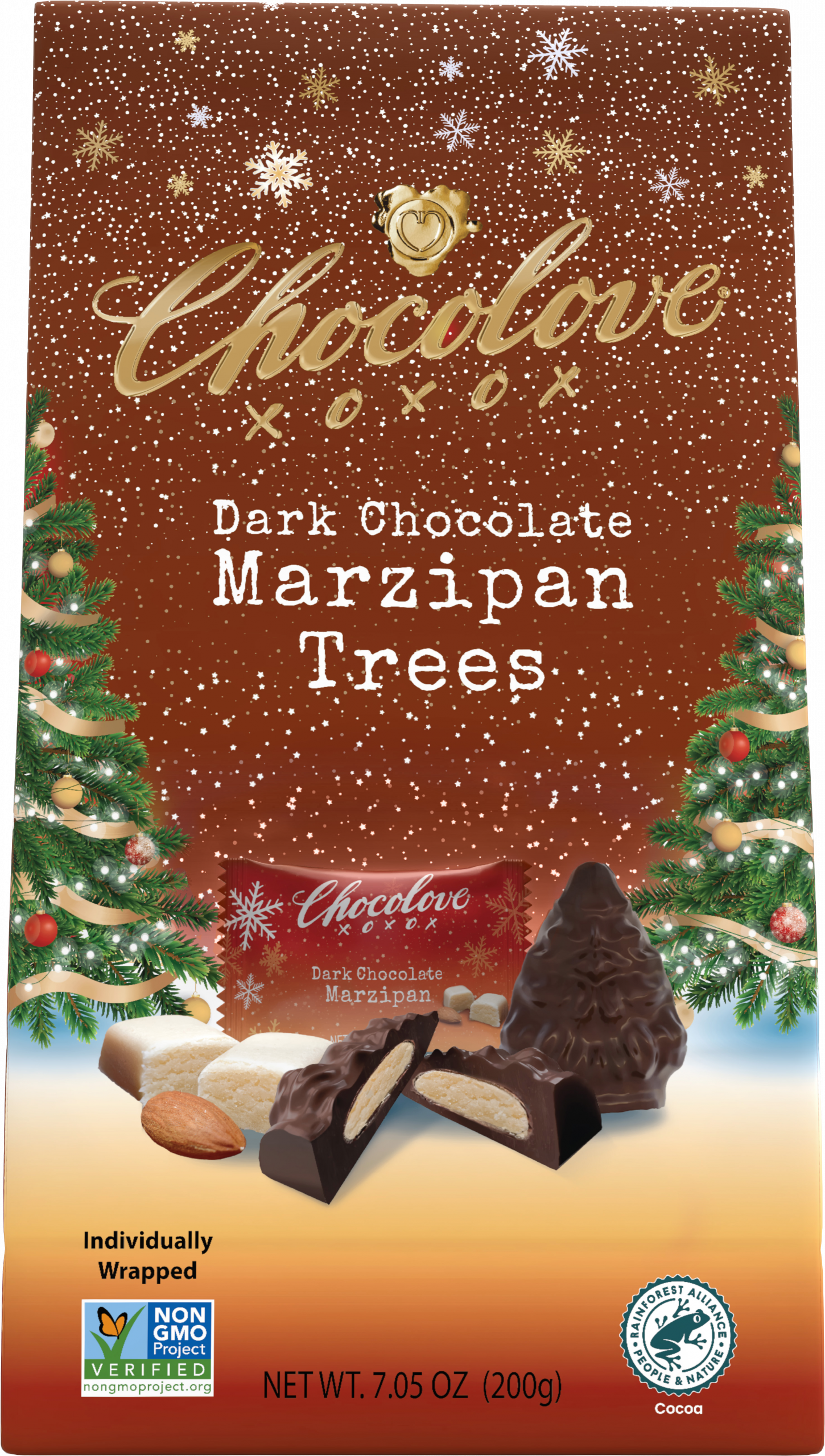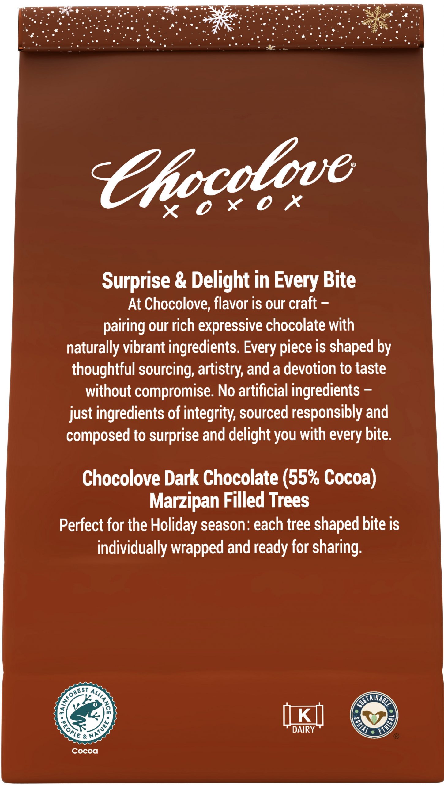 Celebrate the season with our Marzipan in Dark Chocolate Holiday Bites, a festive twist on a classic European confection. Shaped like Christmas trees, each bite features smooth semisweet dark chocolate filled with soft almond marzipan, blending delicate honeyed notes with rich cocoa depth.