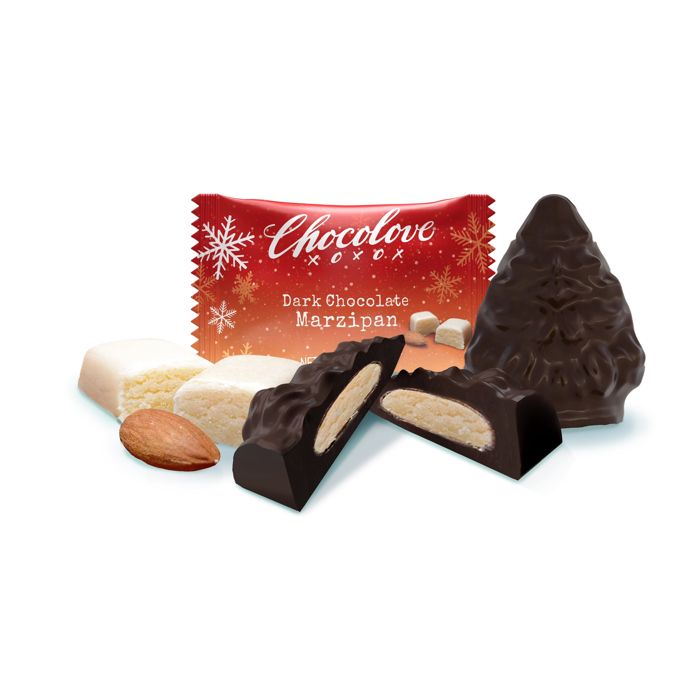 Celebrate the season with our Marzipan in Dark Chocolate Holiday Bites, a festive twist on a classic European confection. Shaped like Christmas trees, each bite features smooth semisweet dark chocolate filled with a silky almond marzipan.
