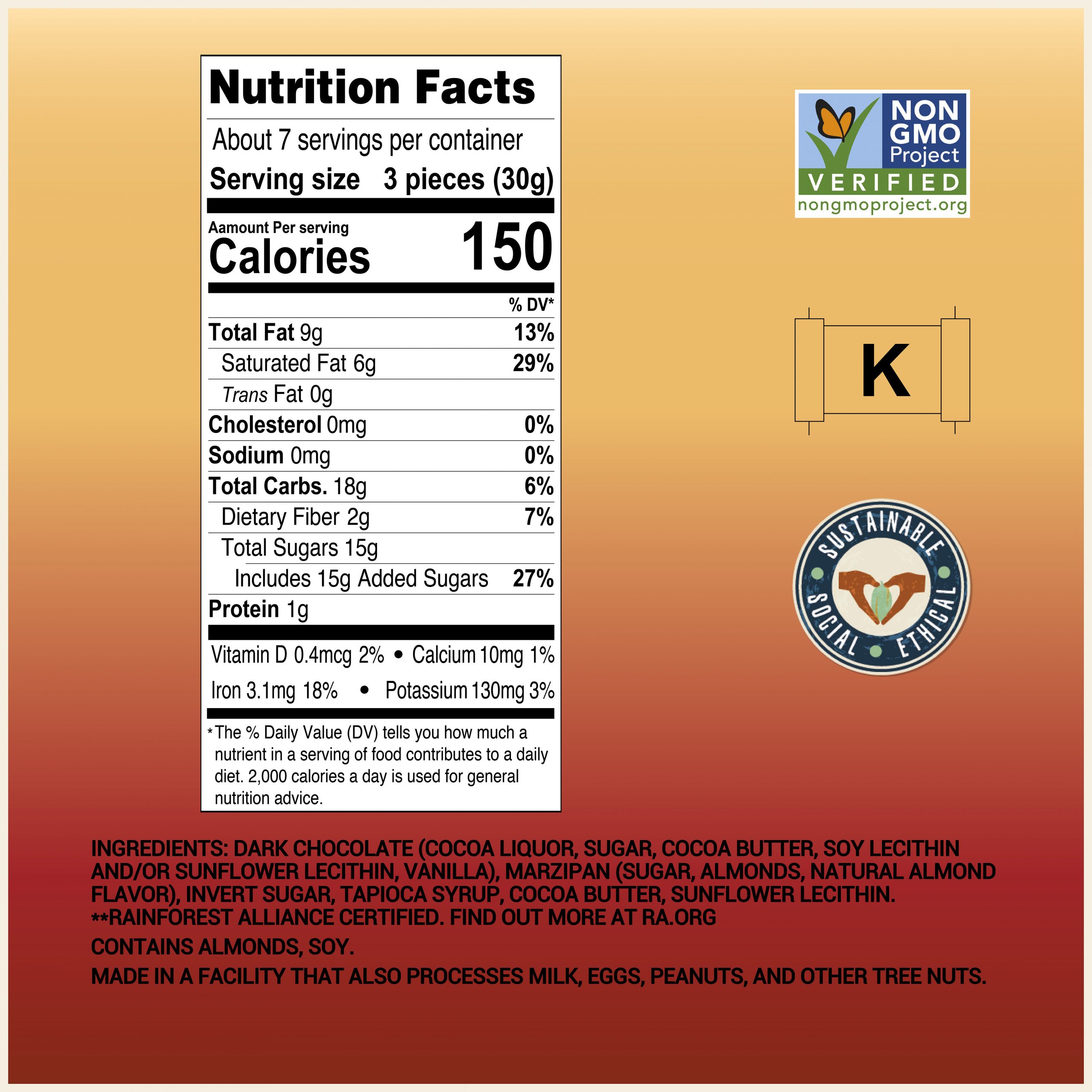 Dark Chocolate (Cocoa Liquor**, Sugar, Cocoa Butter**, Soy Lecithin and/or Sunflower Lecithin, Vanilla), Marzipan (Sugar, Almonds, Natural Almond Flavor), Invert Sugar, Tapioca Syrup, Cocoa Butter, Sunflower Lecithin).