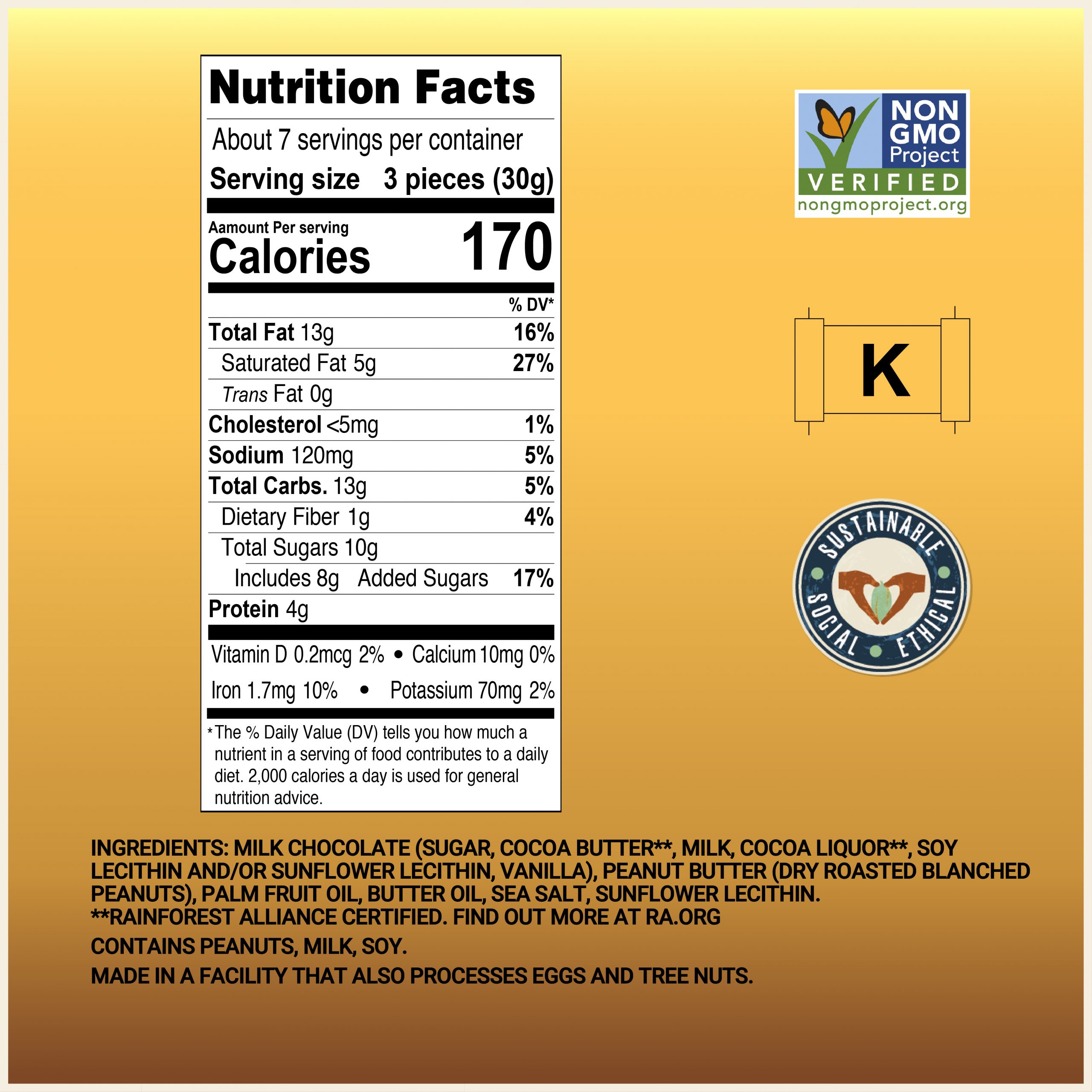 Milk Chocolate (Sugar, Cocoa Butter**, Milk, Cocoa Liquor**, Soy Lecithin and/or Sunflower Lecithin, Vanilla), Peanut Butter (Dry Roasted Blanched Peanuts), Palm Fruit Oil, Butter Oil, Sea Salt, Sunflower Lecithin.